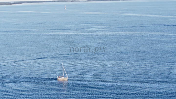 Sailboat navigating the calm waters of the Junkön Archipelago in Luleå, Sweden, on a bright summer day. Drone footage captures the tranquil coastal scene.