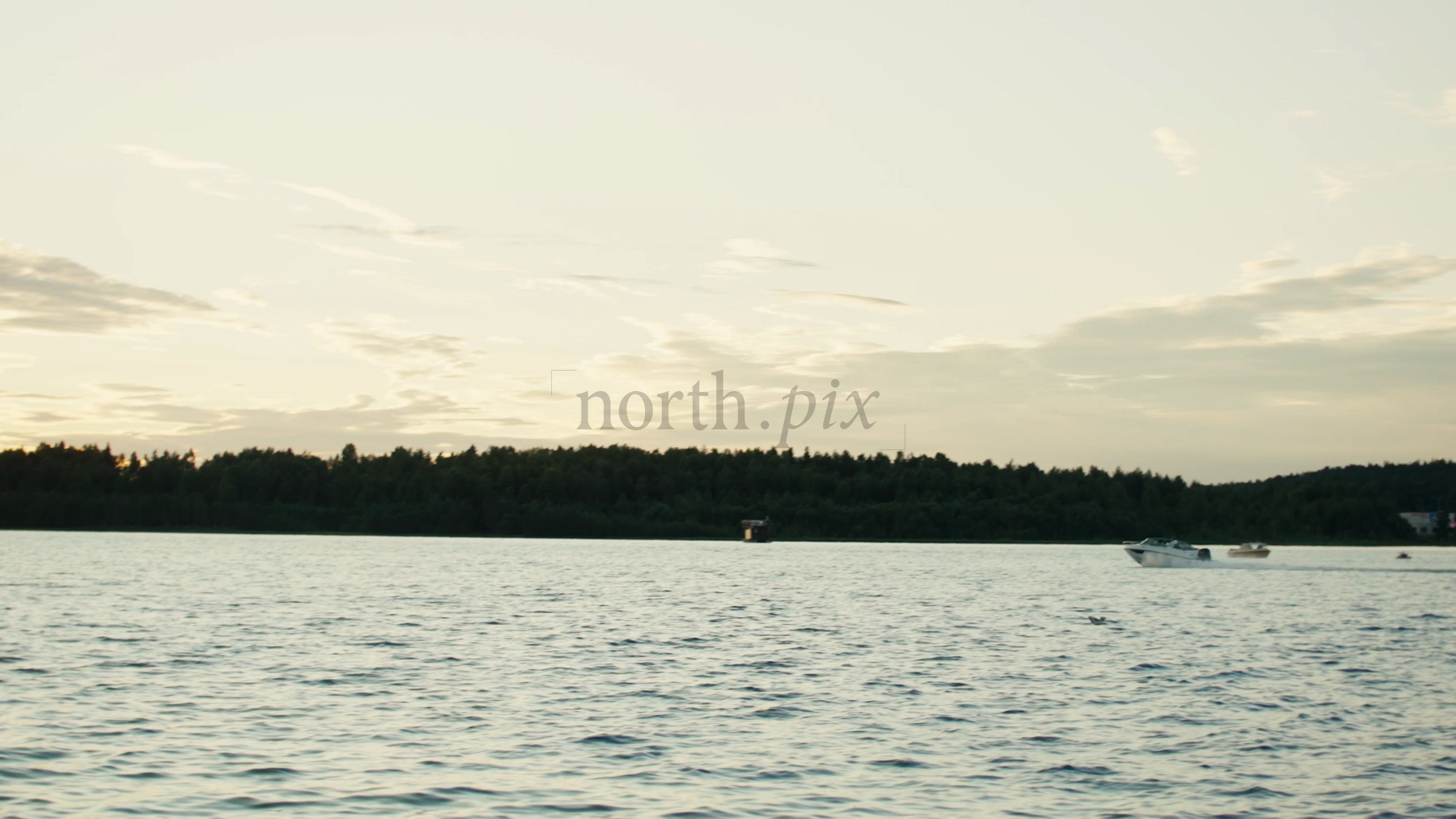 Motorboats are sailing on the Lulea river at sunset. The setting sun paints the sky with beautiful golden hues. Summer evening in Sweden.