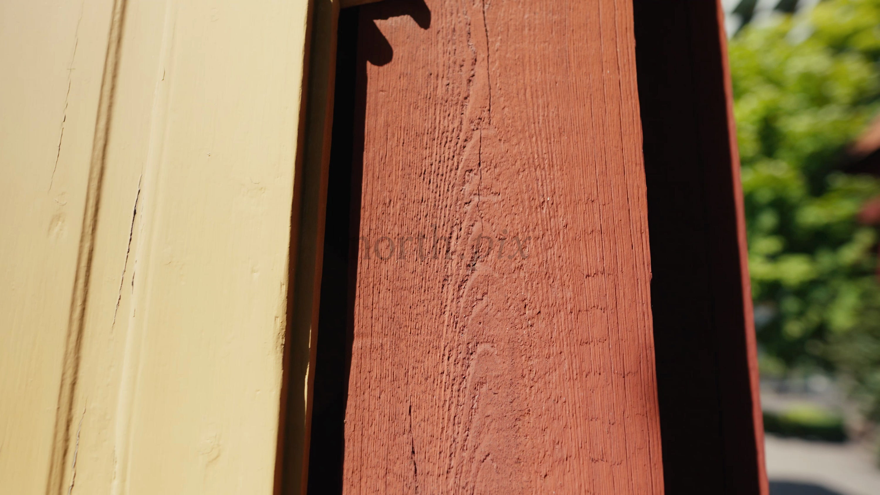 A slow pan from traditional red wood architecture to a modern office building. A sharp contrast between old and new, showcasing a dynamic urban landscape.
