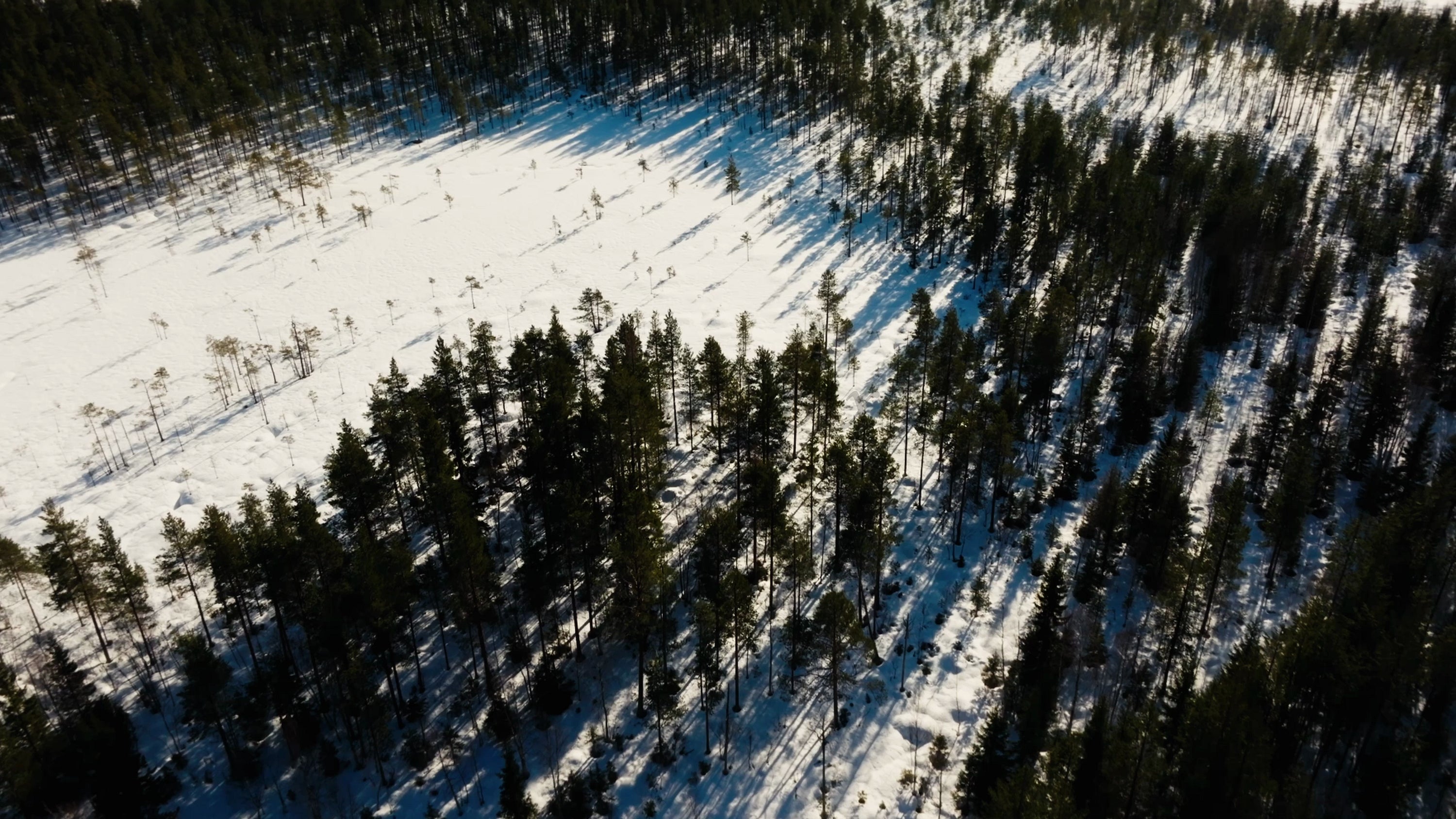 Aerial view of a wind turbine in a snowy forest. The camera moves forward, revealing the turbine and the surrounding landscape.