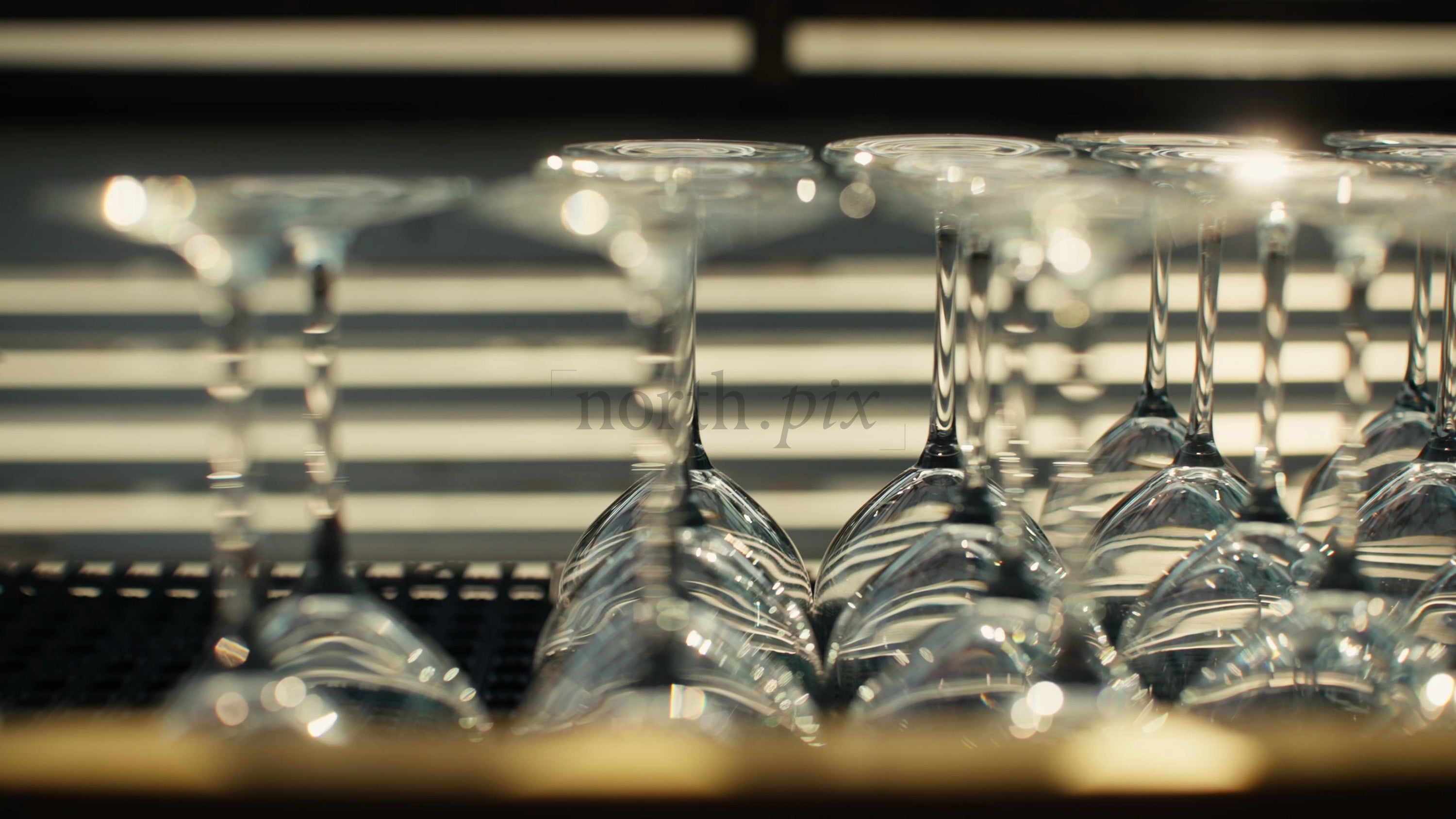 Close-up of empty wine glasses on a bar counter in the sunlight. The camera moves slowly from right to left, capturing the light reflecting off the glasses. This video evokes feelings of anticipation and celebration, perfect for projects related to nightlife, special occasions, or luxury lifestyle.
