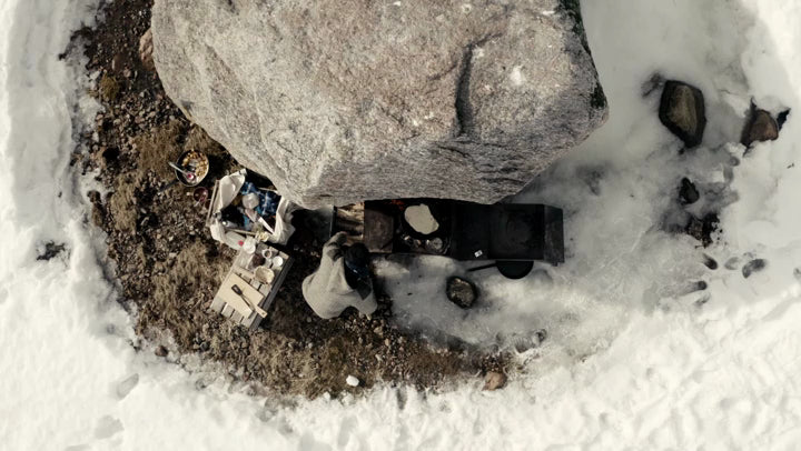 Overhead drone view of person cooking over a portable camping stove in a winter wonderland by a large rock. The snowy landscape suggests cold temperatures and peaceful vibes.