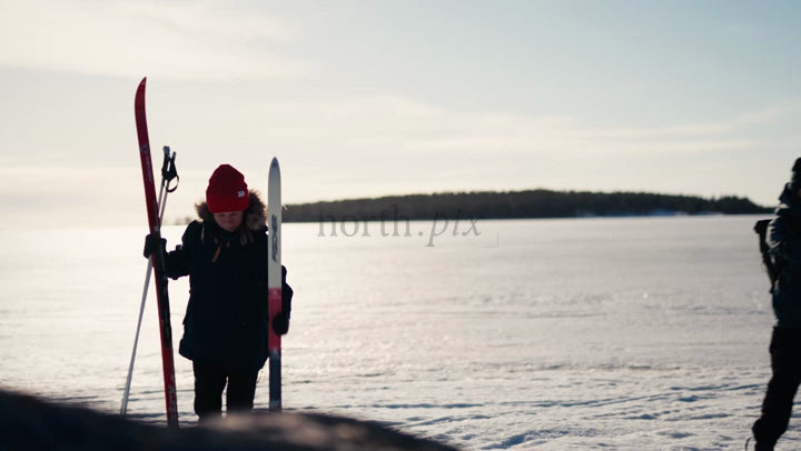 Winter Cross-Country Skiing Preparation on Frozen Lake in Luleå Archipelago, Sweden