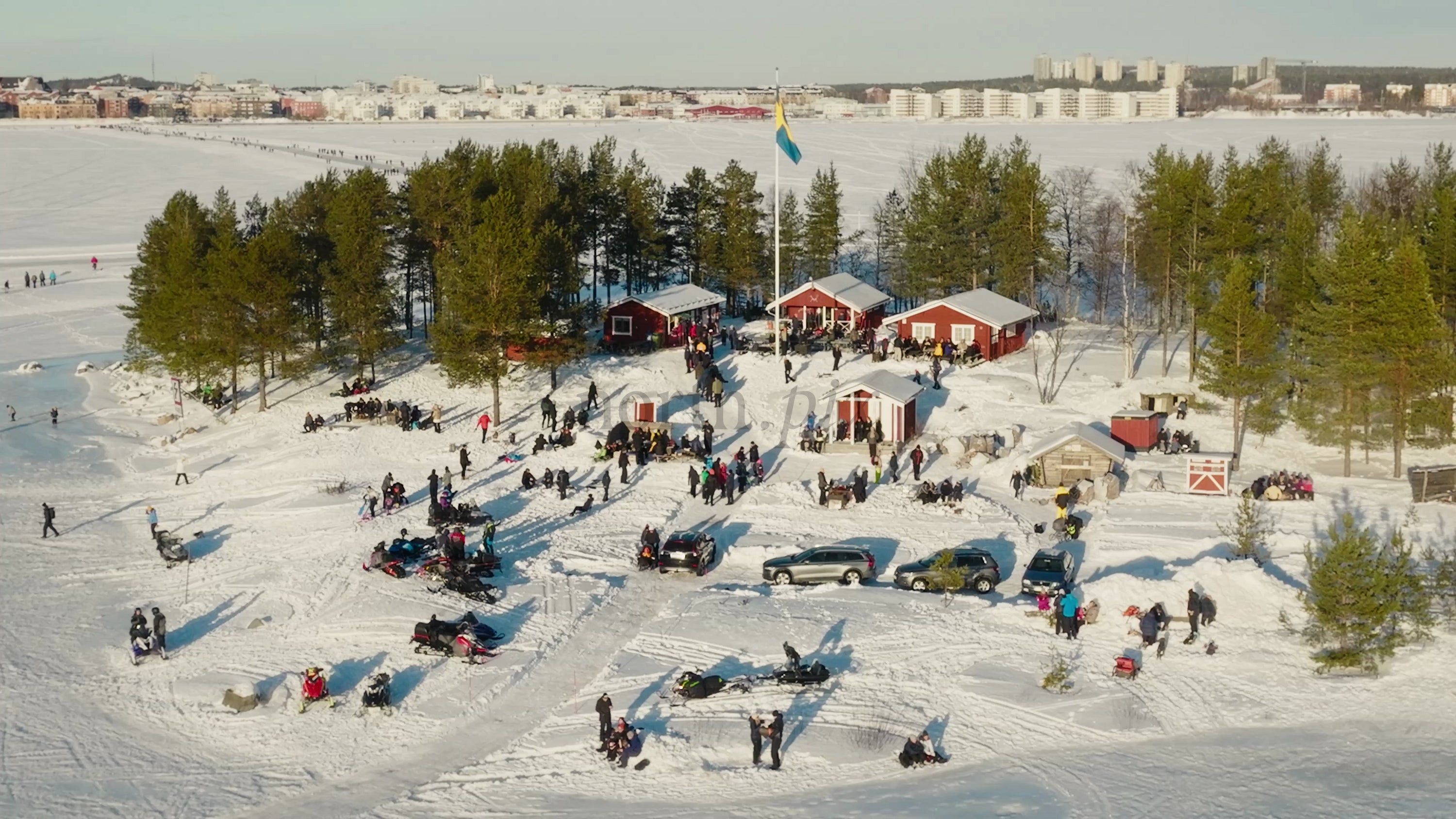 Aerial drone footage of a winter landscape in Lulea, Sweden. People gather on a snowy island with snowmobiles. The city skyline is visible across the frozen water.