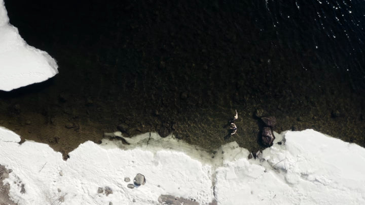Winter Ice Bathing in Luleå, Sweden: Aerial Drone View of Two People in Icy Water