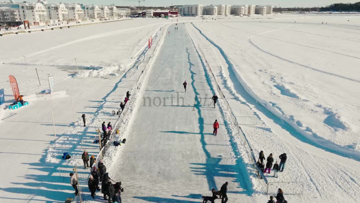 People ice skating and enjoying winter activities on a frozen track in Luleå, Sweden. Drone footage captures the winter scene with buildings in the background.