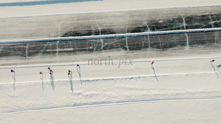People ice skating on a frozen lake in Luleå, Sweden. Aerial drone footage captures the winter activity on a bright day.