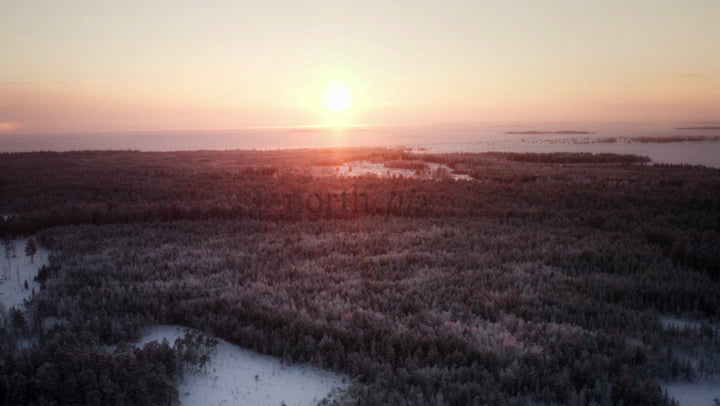 Winter Sunrise Over Frozen Sea and Forest in Lulea, Sweden