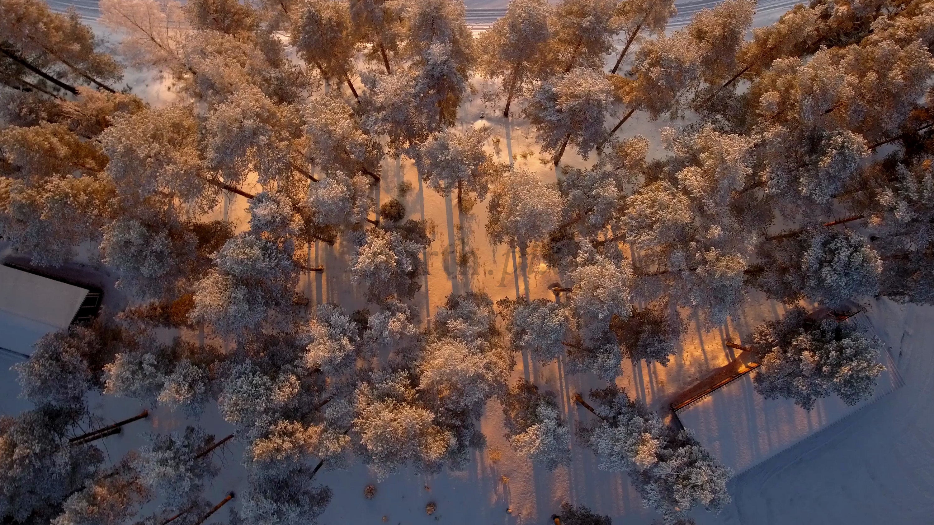 Aerial view of a snowy forest and frozen lake in Gunnarsbyn, Sweden. Winter landscape at sunset with snow covered trees and bridge.