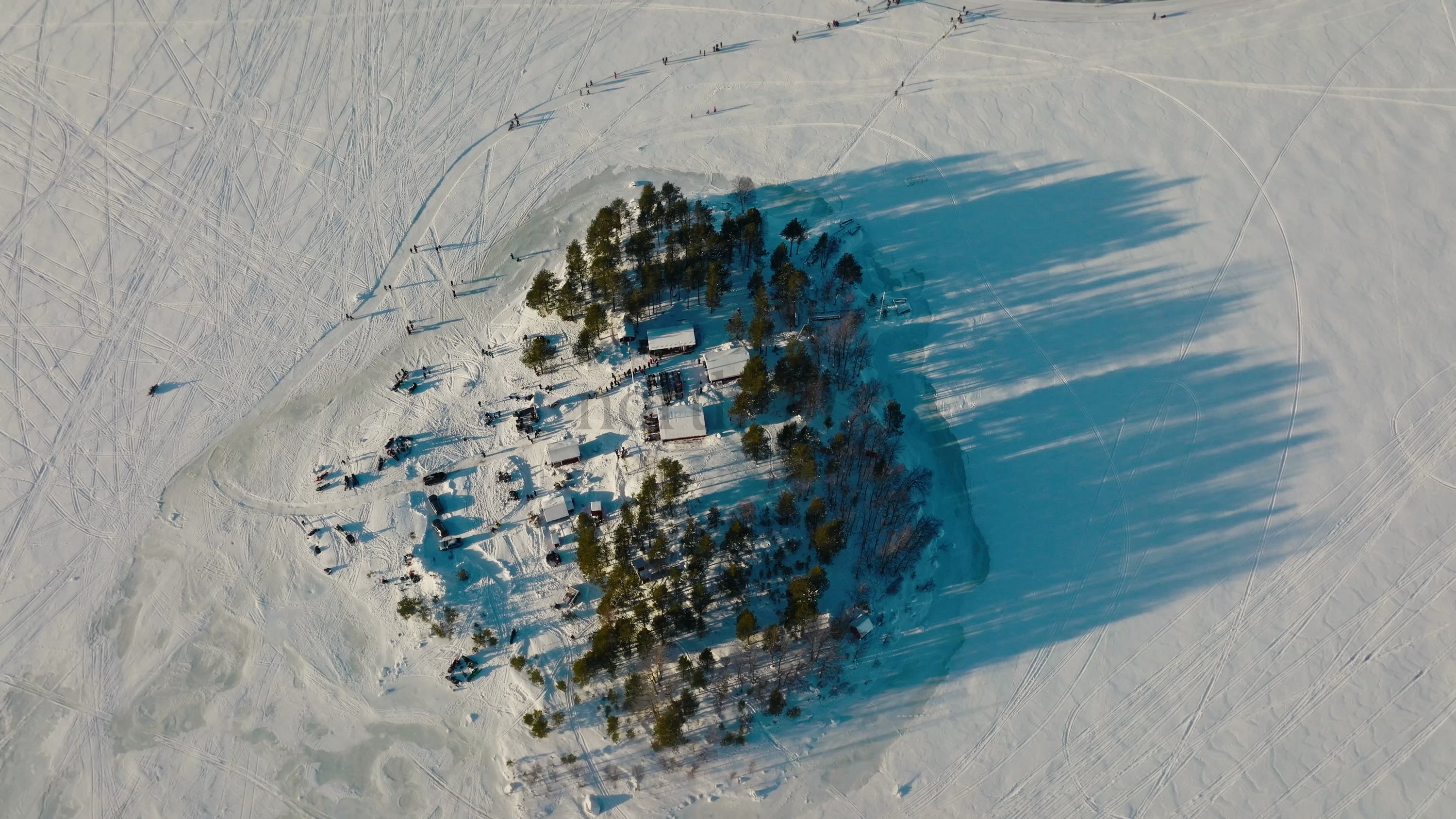 Aerial drone footage of a winter landscape in Lulea, Sweden. People gather on a small snowy island. The long shadows of trees reflect the evening light of day.