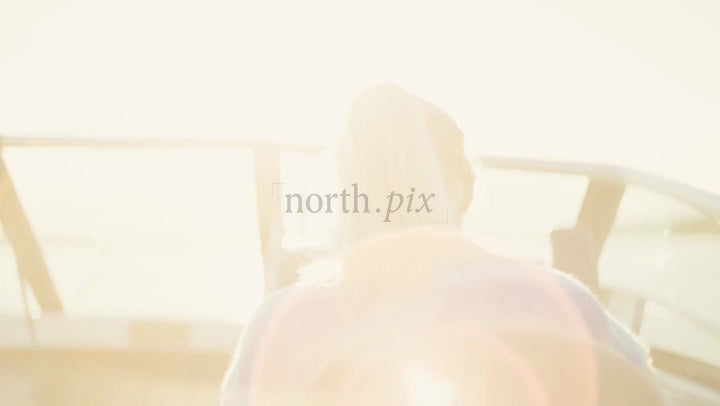 Woman steers boat in the Luleå Archipelago, Sweden. Summer sunshine creates lens flare. Baltic Sea. POV shot.