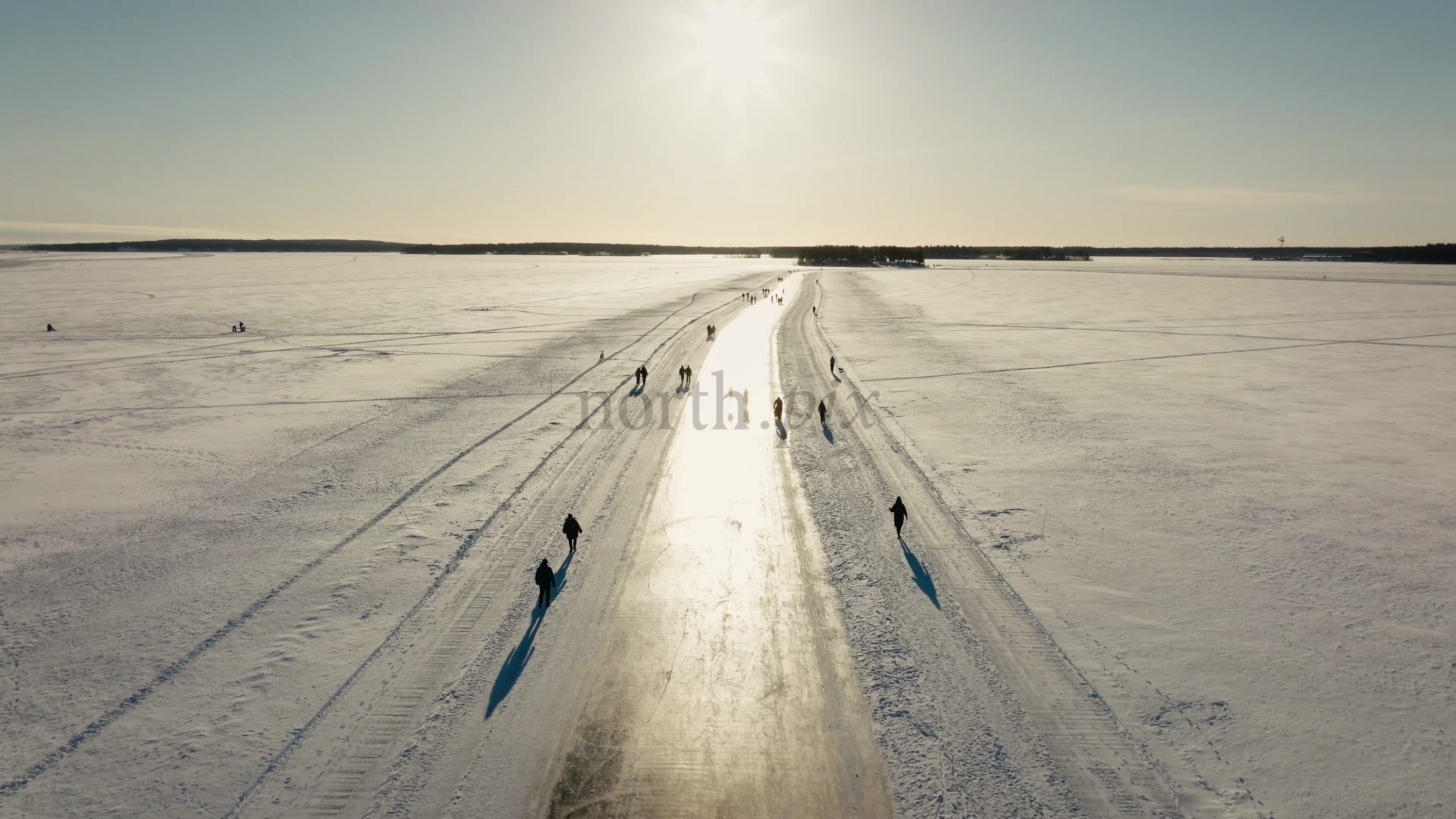 Flygfoto från drönaren på människor som åker skridskor och går på en frusen sjö i Luleå, Sverige. Vintersolen reflekteras på den glittrande isvägen och visar upp en vinterdags skönhet.