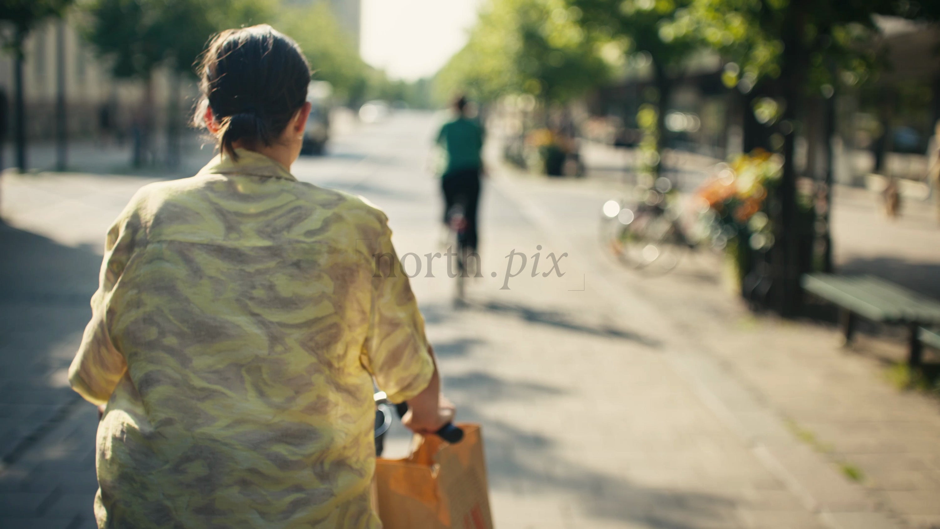 Kvinna som cyklar i Luleå centrum på en solig dag. Stadspendling, hållbara transporter, hälsosam livsstil. Aktiva människor njuter av sommaren. Handhållen bild.