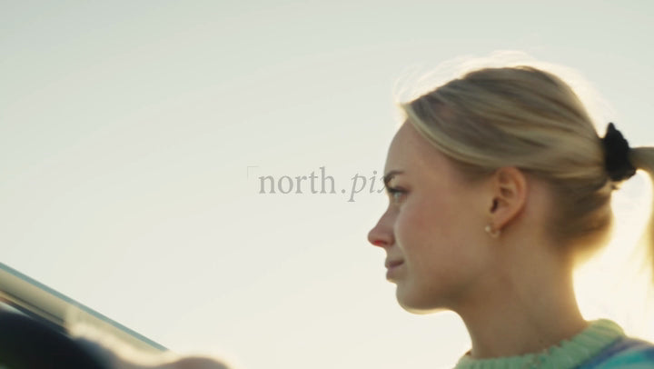 Ung kvinna styr båt i Luleå skärgård under gyllene timmen. Sommarscen av stillhet och utforskning i Sverige.