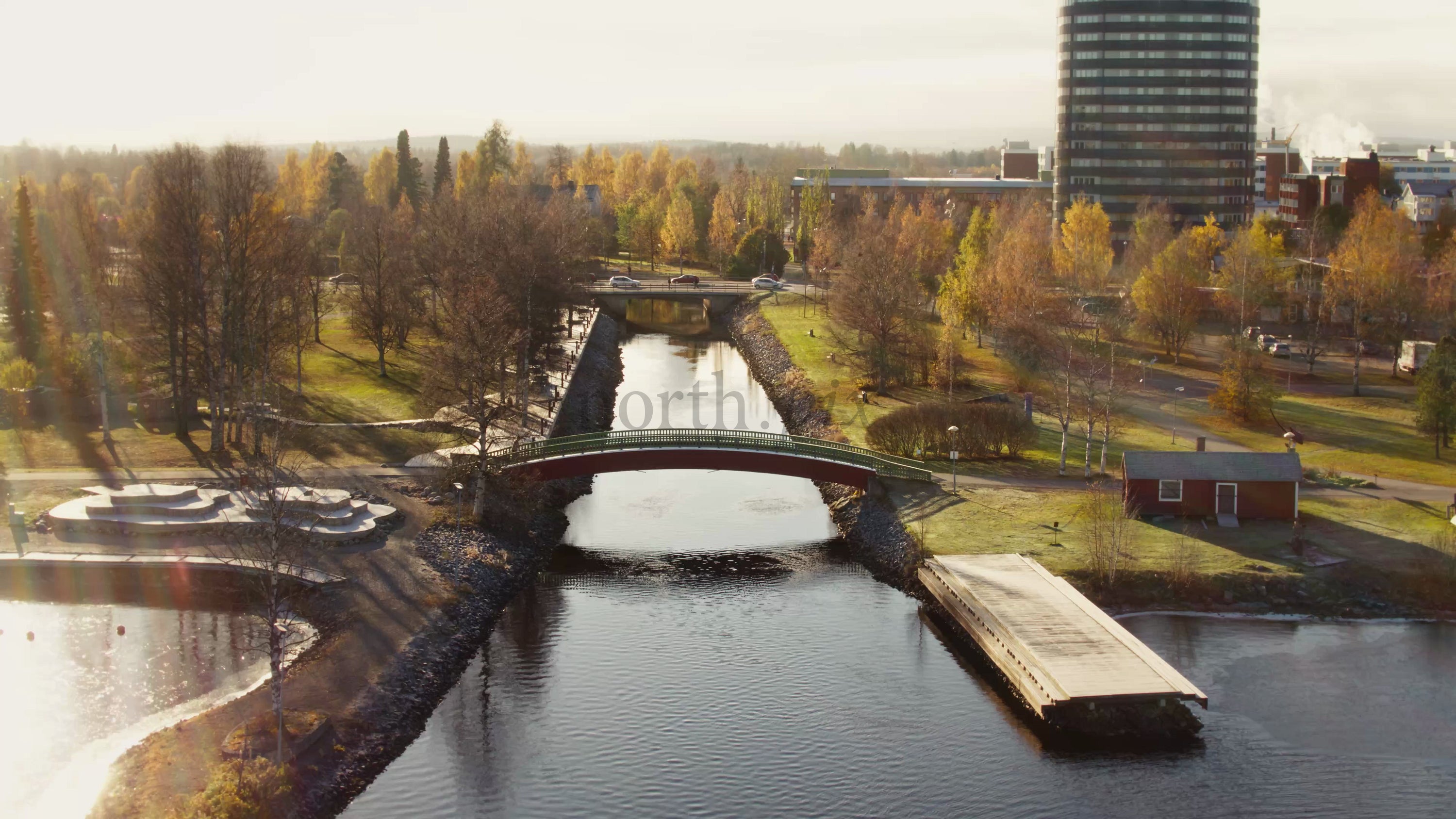 Piteå City in autumn, with golden foliage surrounding a peaceful canal. A person walks on a bridge, adding a human element to this beautiful urban landscape.