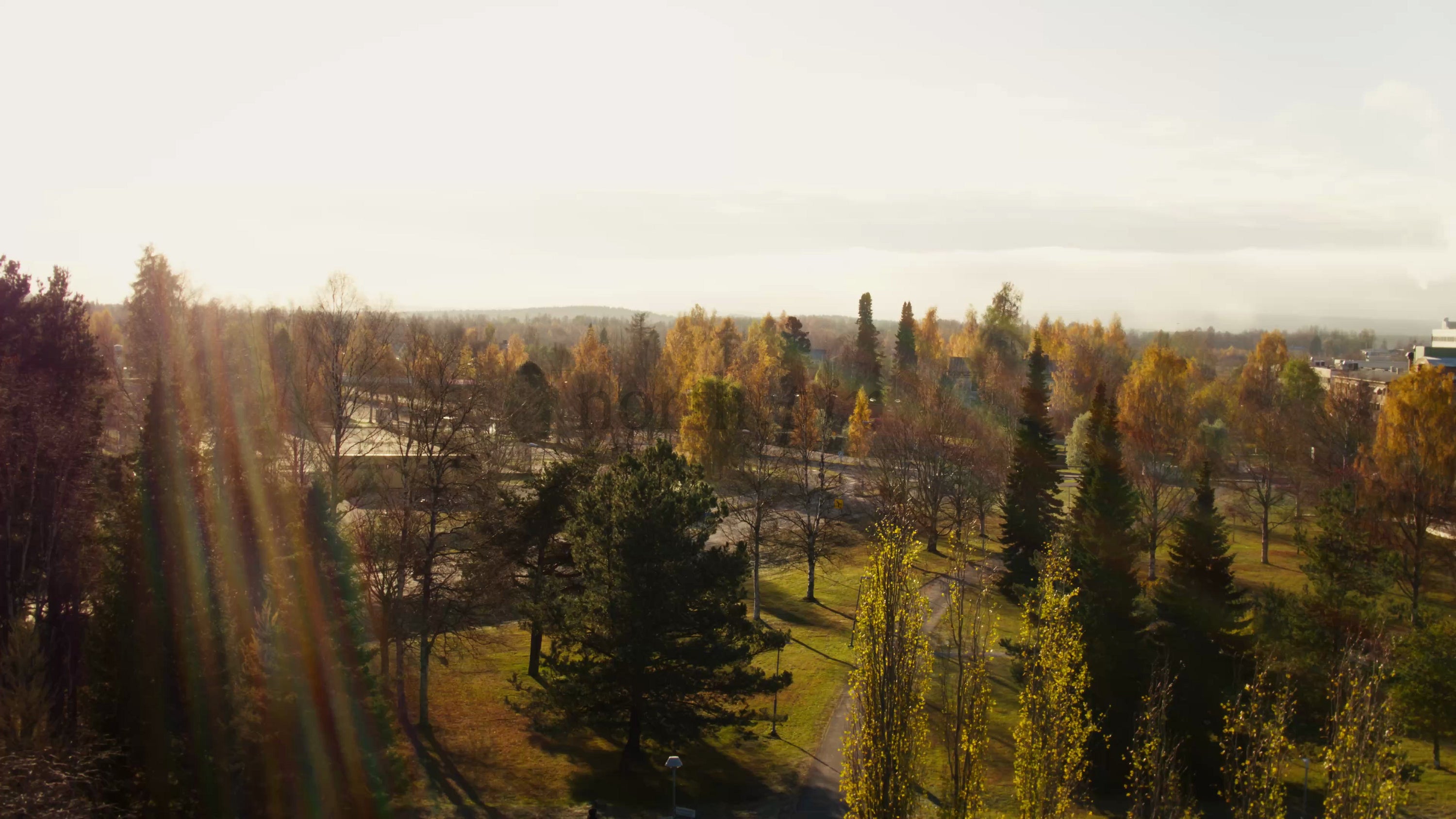 An aerial drone shot captures a picturesque autumn city landscape, showcasing vibrant golden and yellow trees under a bright, sunny sky. Cars drive along the roads, surrounded by nature and buildings.